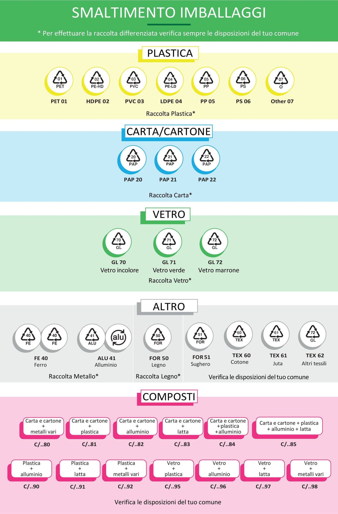 Ricordati comunque di verificare le disposizioni del tuo comune poiché ogni sistema di raccolta dei rifiuti potrebbe presentare delle specifiche disposizioni sulla raccolta di alcune tipologie di materiale.