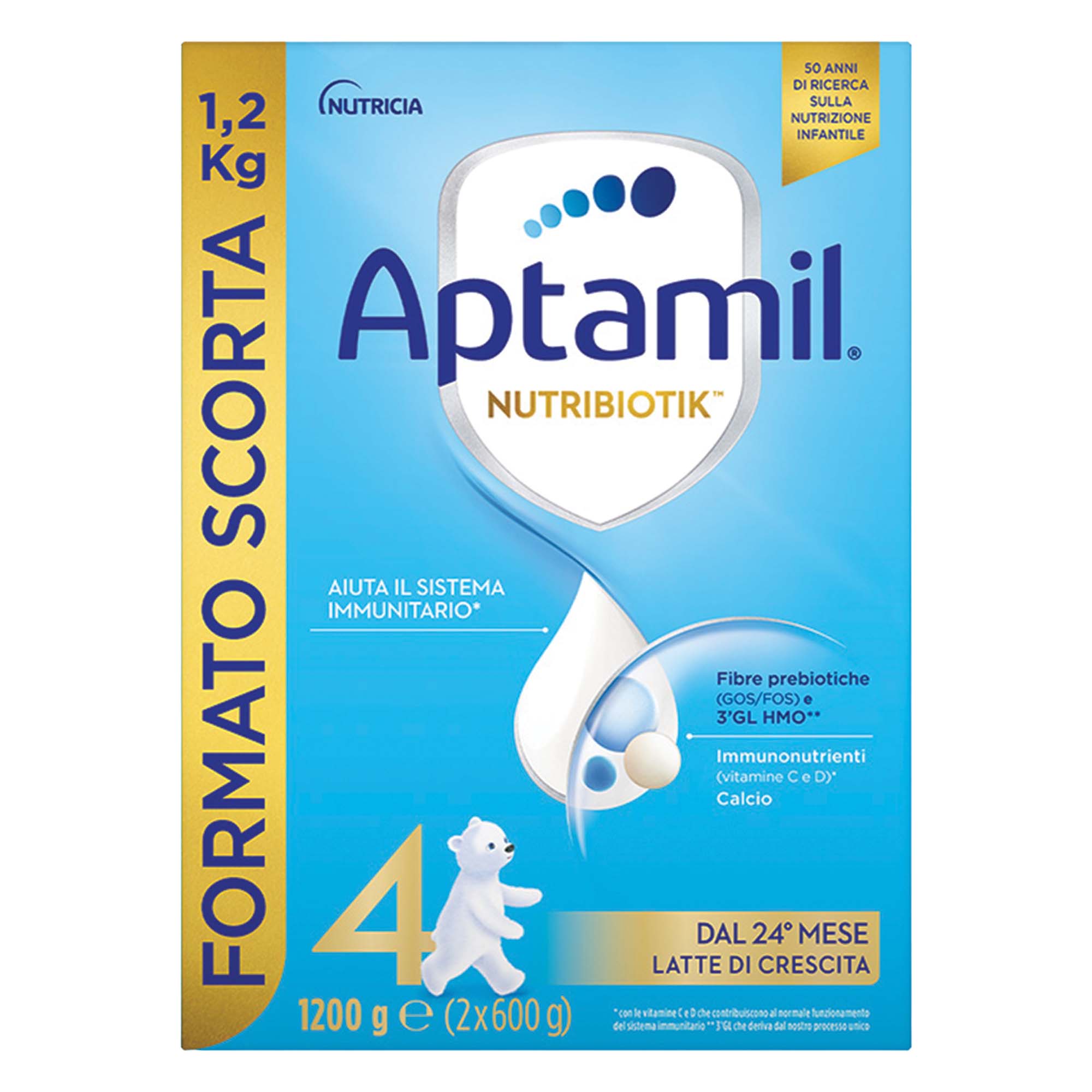APTAMIL Nutribiotik 4 aiuta il sistema immunitario grazie alla presenza di Immunonutrienti (vitamine C e D). Contiene inoltre DHA* per contribuire allo sviluppo del cervello e del sistema nervoso e CALCIO per contribuire al normale sviluppo delle ossa