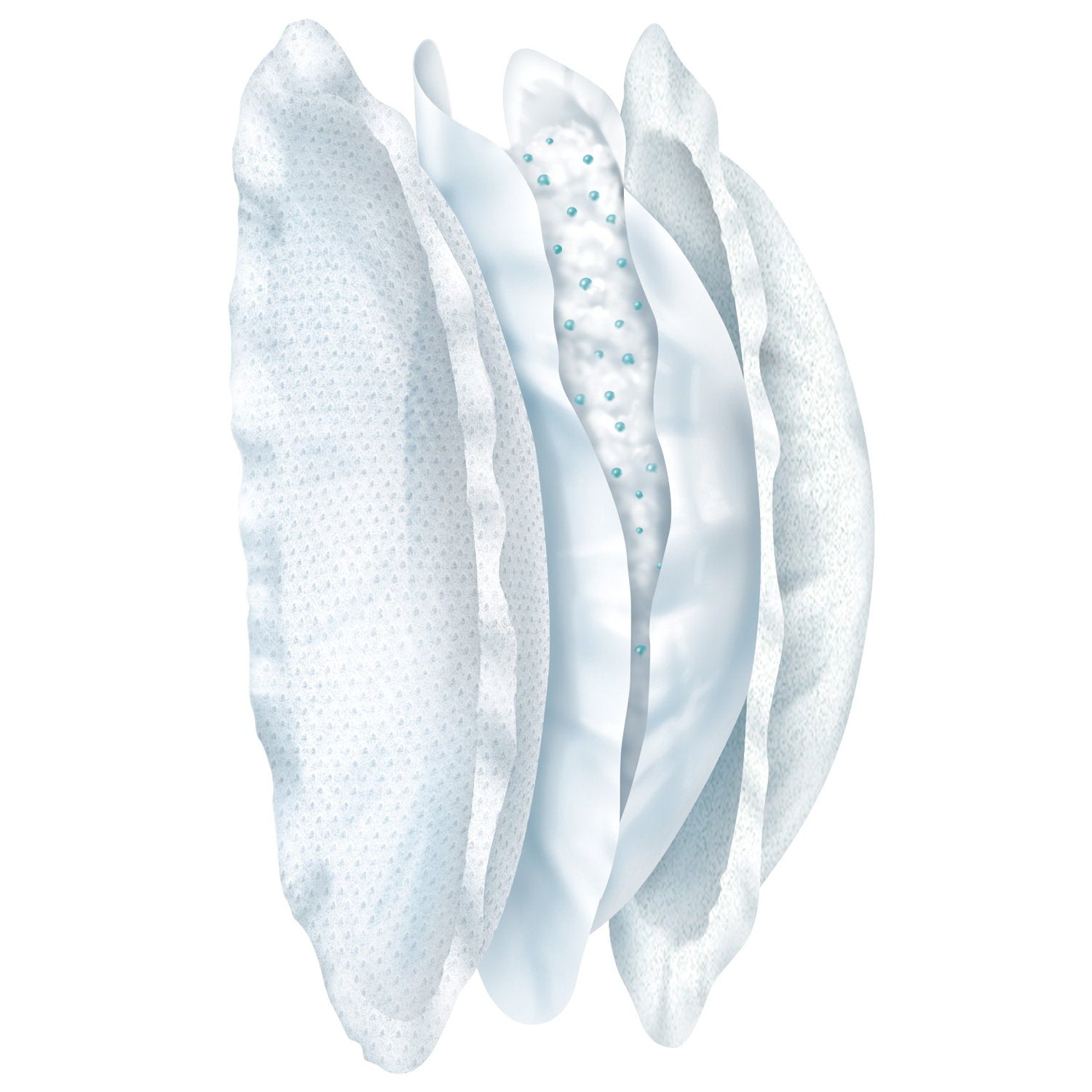 Lo strato ultra assorbente inoltre assicura una pelle sempre asciutta. la forma sagomata e le strisce adesive per mantenere la coppetta in posizione, assicurano il massimo della discrezione sotto i vestiti.