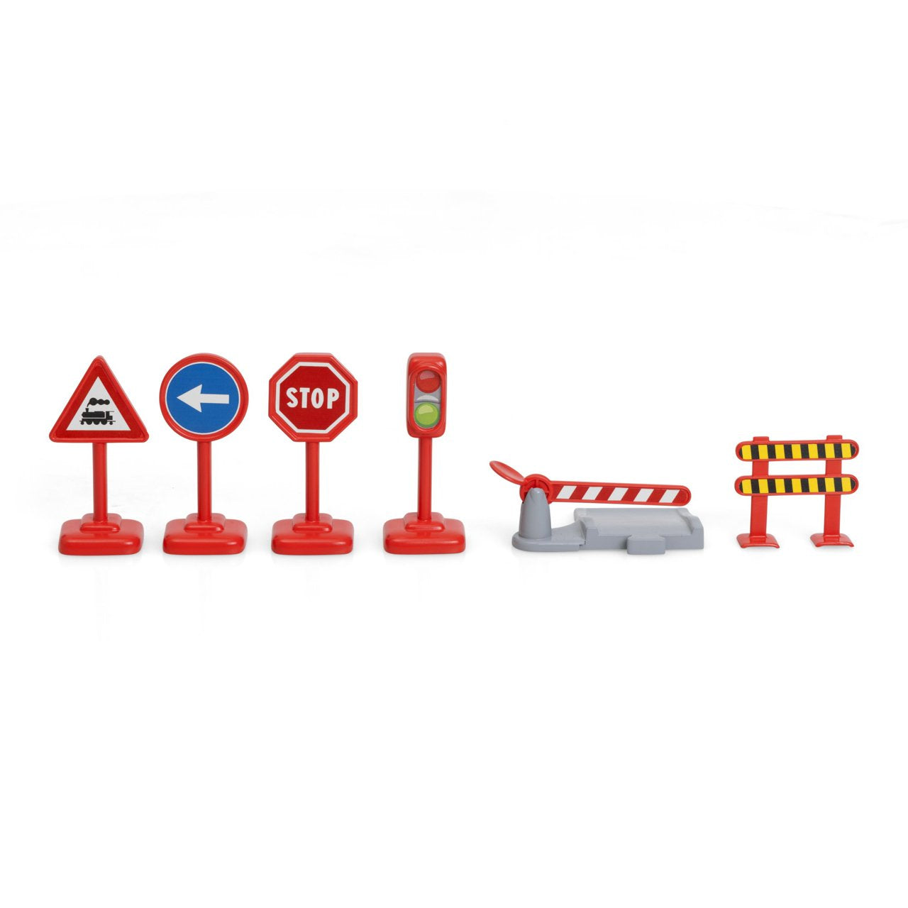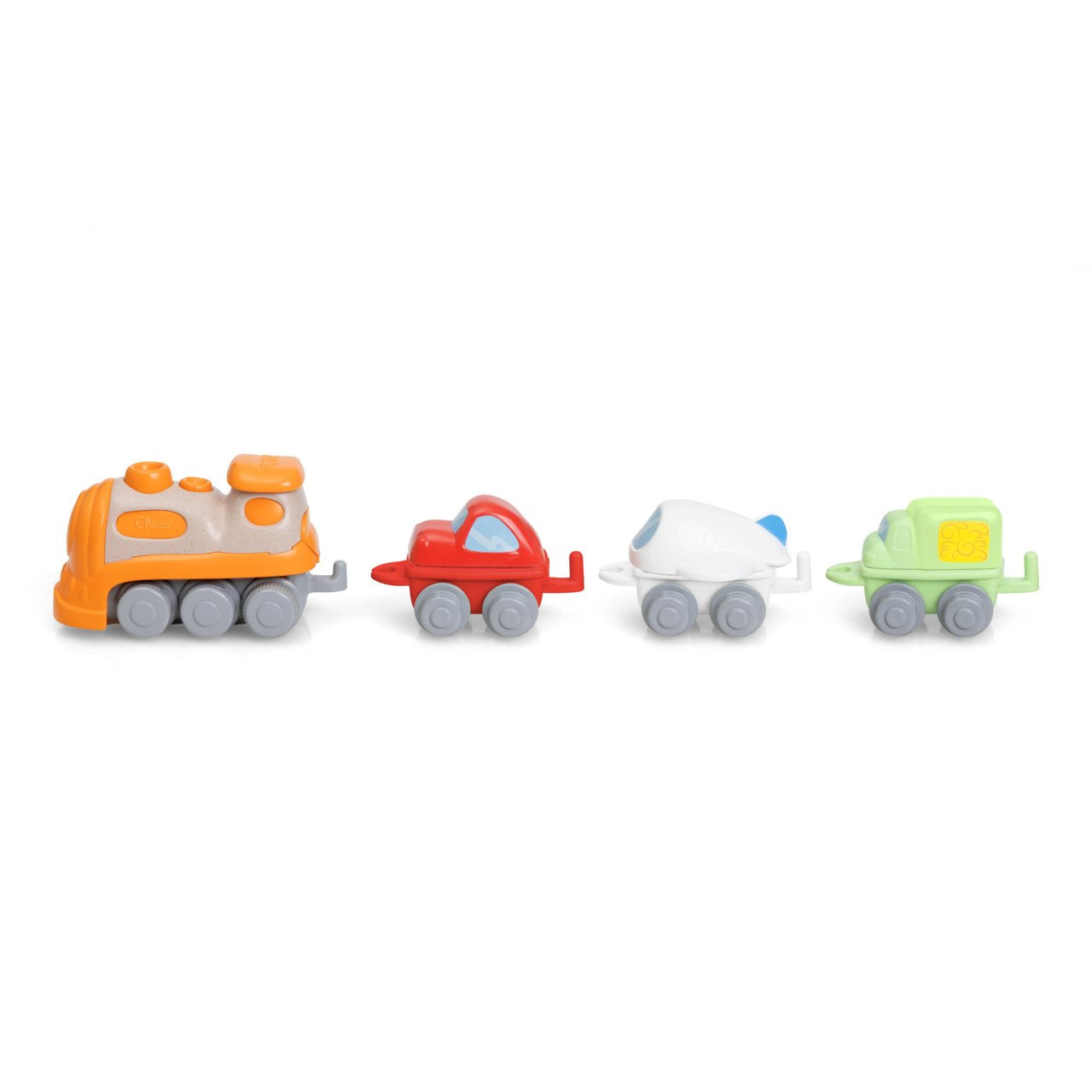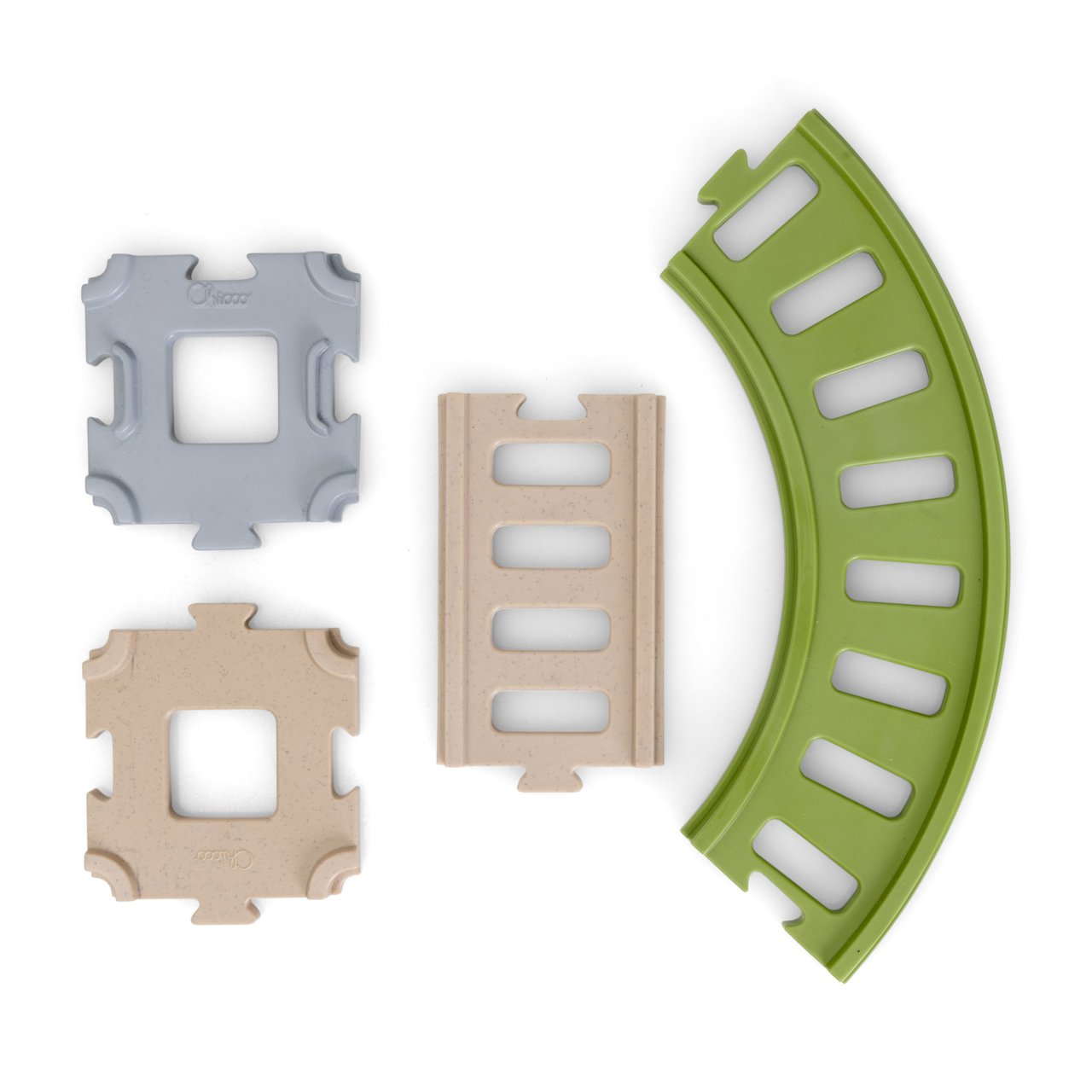 Set ferroviario completo con locomotiva elettronica push&go e 3 vagoni intercambiabili per creare fino a 3 piccoli veicoli diversi: aereo, camion e macchina. Include 34 pezzi totali con 4 configurazioni di binari differenti (circuito chiuso in varie forme e aperto), stazione con orario mobile, tunnel, 6 segnali stradali e 4 passaggi a livello sollevabili.