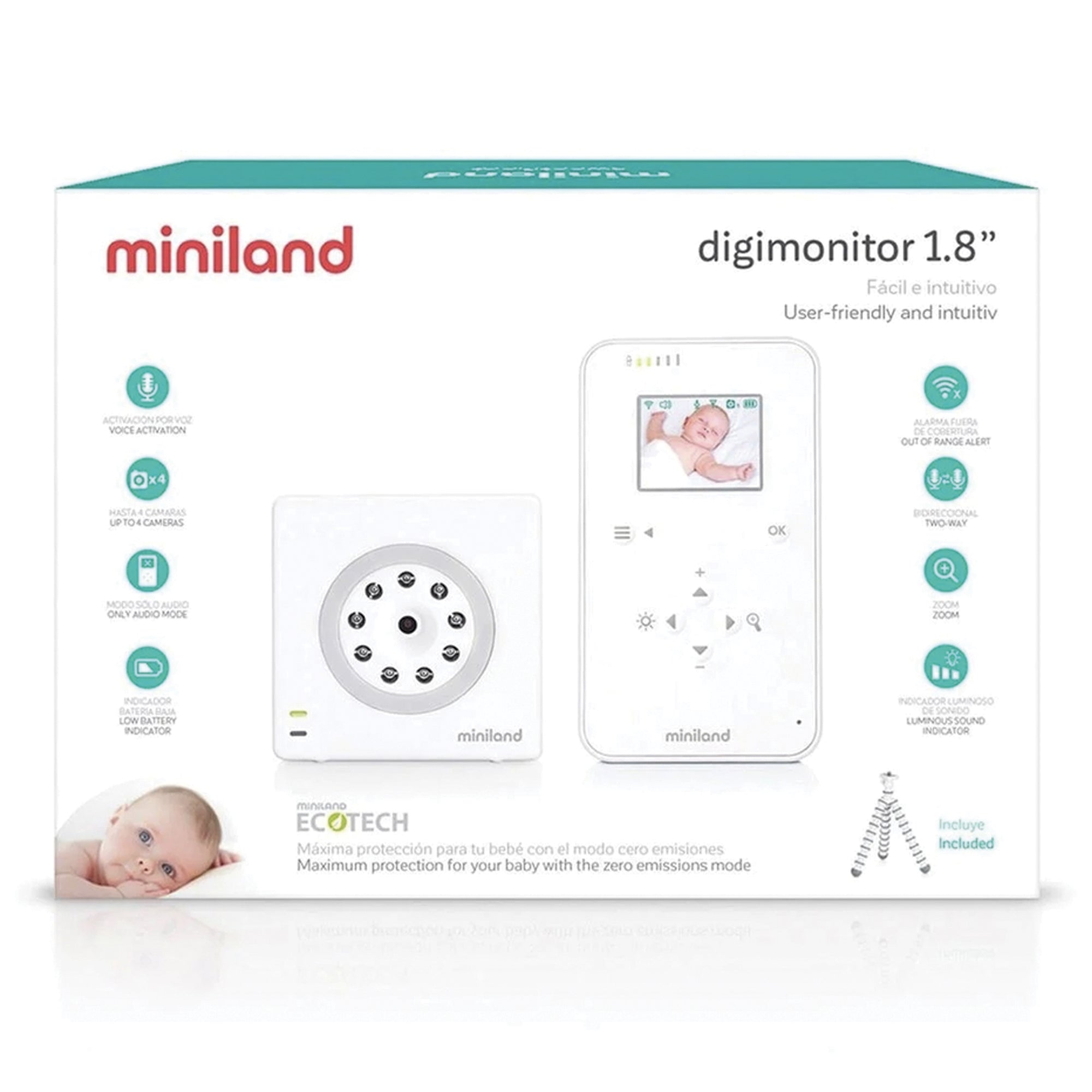 Il Baby Monitor Digitale Miniland con schermo da 1.8" offre immagini nitide e ad alte prestazioni per controllare il tuo bambino con la massima chiarezza.