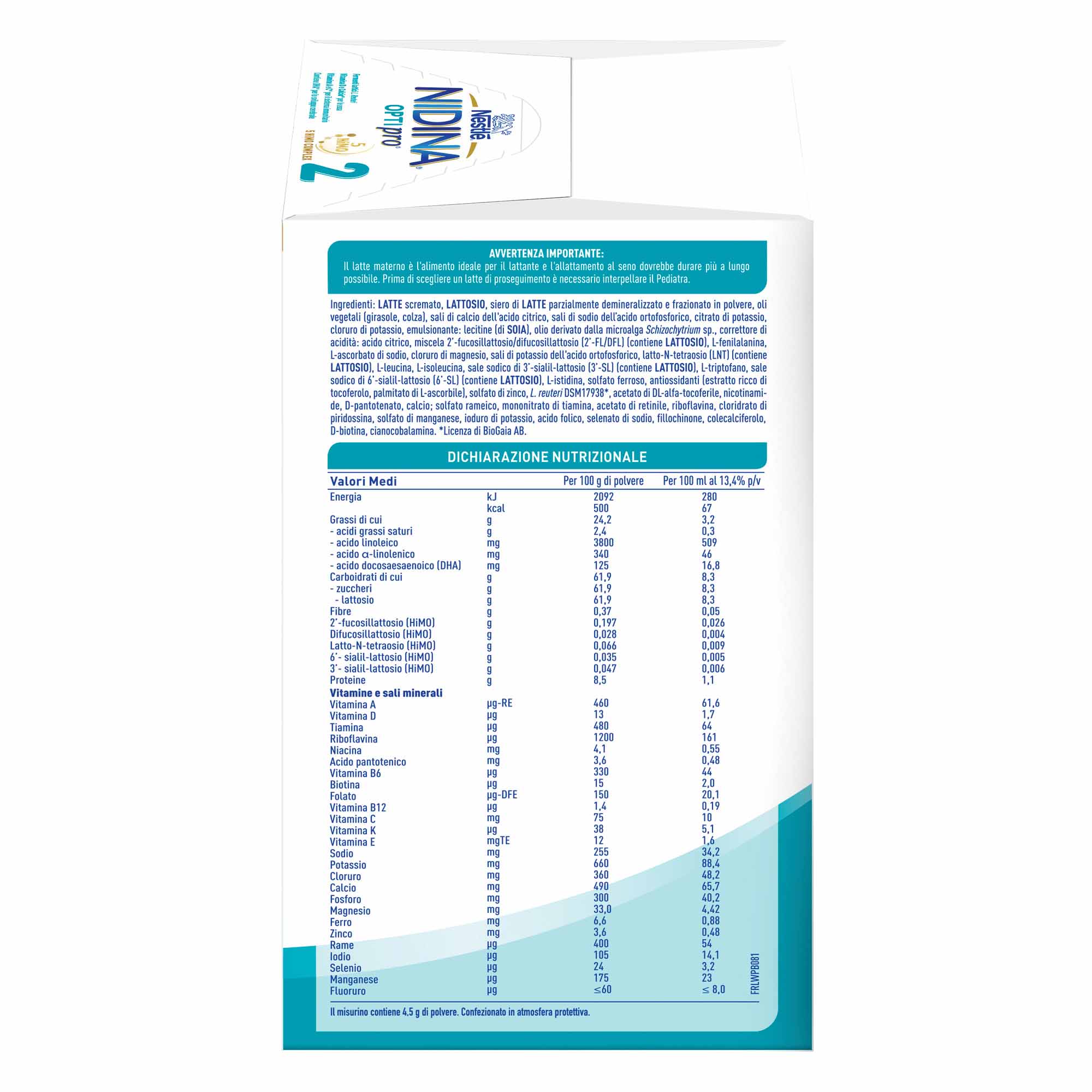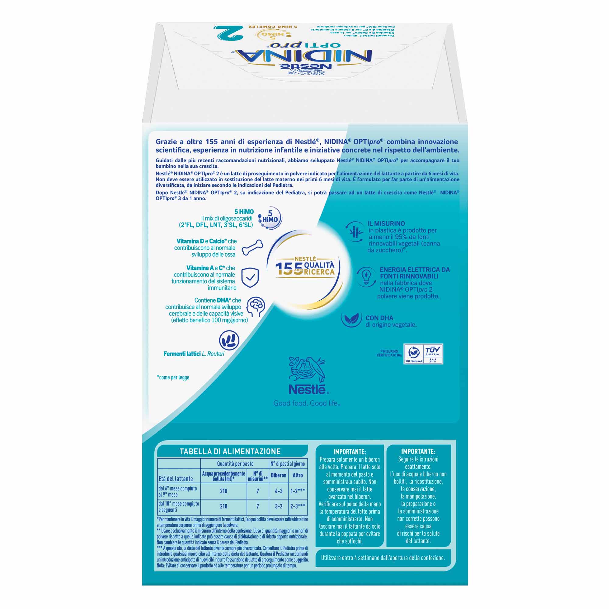 Nestlé® NIDINA® OPTIpro® 2 è un latte di proseguimento in polvere indicato per l'alimentazione del lattante a partire da 6 mesi di vita. Non deve essere utilizzato in sostituzione del latte materno nei primi 6 mesi di vita. È formulato per far parte di un'alimentazione diversificata, da iniziare secondo le indicazioni del Pediatra.