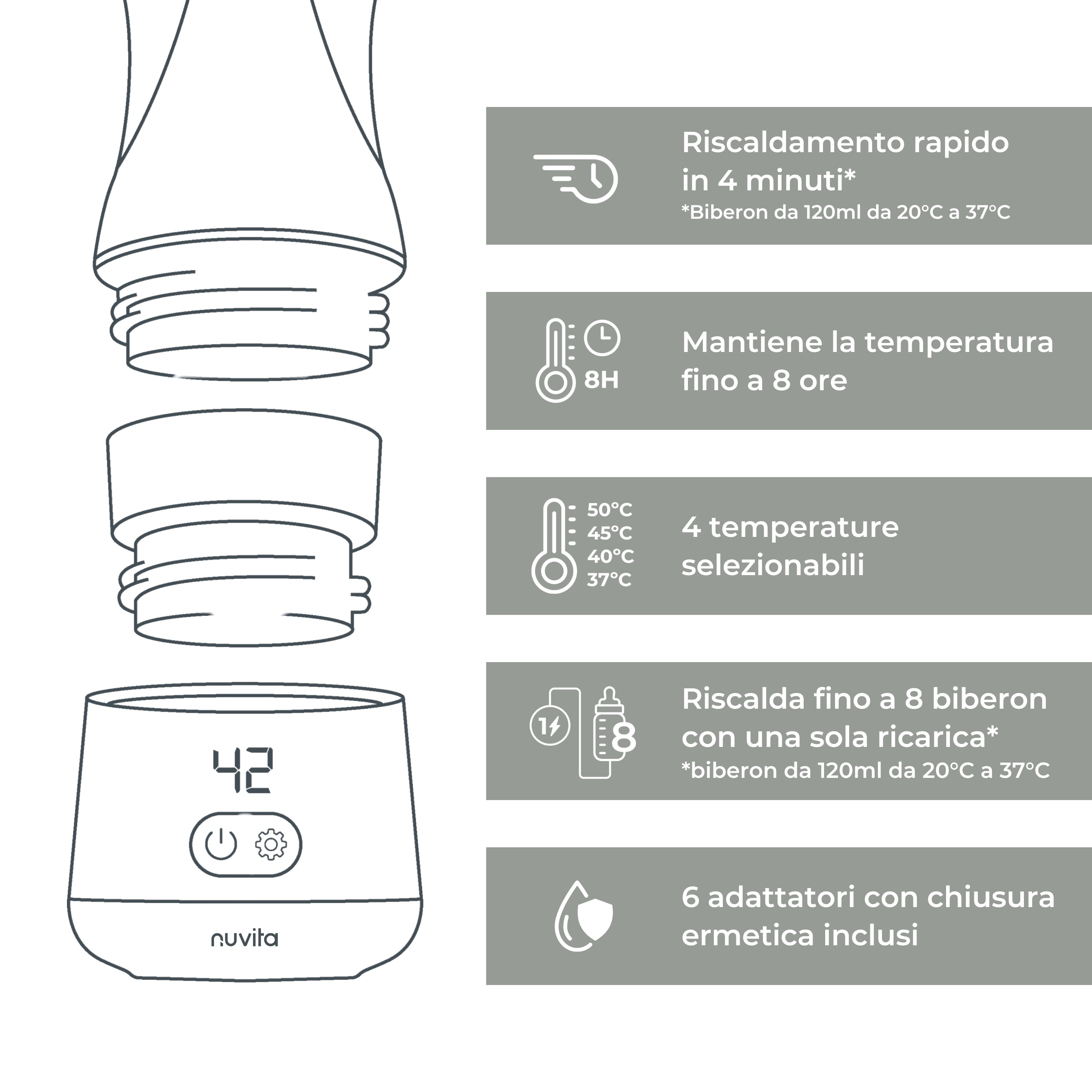 Fornisce acqua calda alla giusta temperatura sempre a portata di mano, ideale per poppate notturne e viaggi. Facilita l'alimentazione del bambino in qualsiasi situazione, offre lunga autonomia e facilità d'uso.